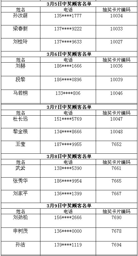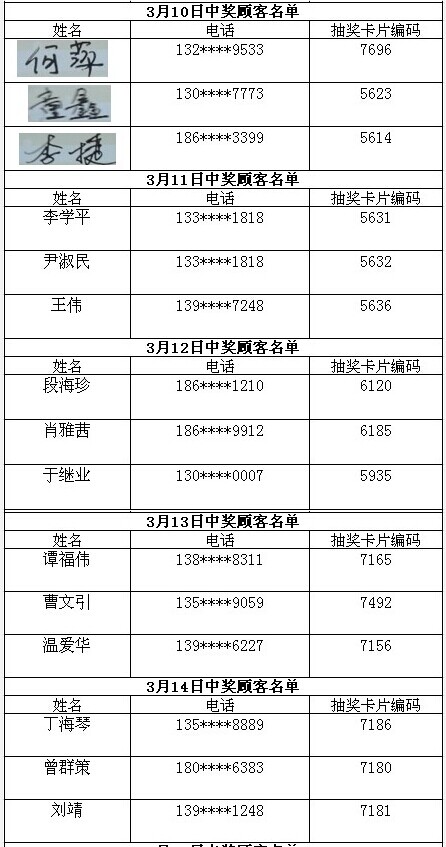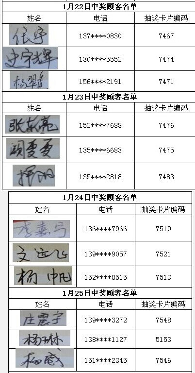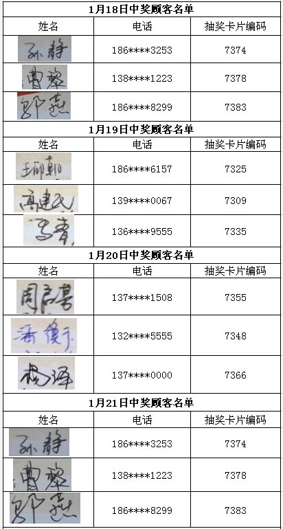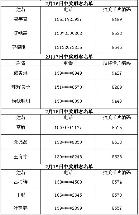 每日中獎名單公布如下: