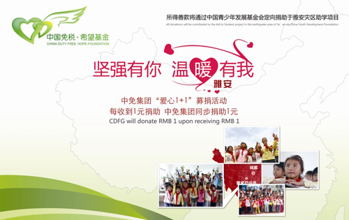 在四川雅安地震發(fā)生后,中免集團與中國青少年發(fā)展基金會(以下簡稱“青基會”)緊急協(xié)商籌備,決定通過“中國免稅希望基金”,在中免集團全體員工、各下屬門店以及門店消費者中發(fā)起主題為“愛心1+1”的募捐活動。 “愛心1+1”即中免集團將對消費者所捐善款按1:1進行配比,最終通過青基會用于雅安震后教育設施恢復和兒童復學項目,同時中免集團也將通過官網(wǎng)與官方微博第一時間公布善款使用情況,所有捐款接受專項審計。活動將持續(xù)至5月20日,在此期間,公眾可在中免集團三亞免稅店以及各邊境、機場免稅店參與本次愛心捐助活動。