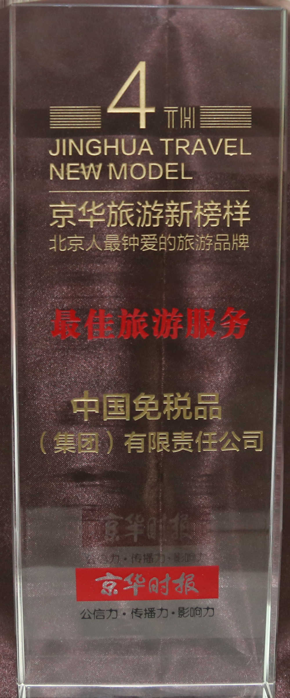 2015年3月13日,由京華時(shí)報(bào)社主辦,京華旅游周刊、京華網(wǎng)承辦的“第四屆京華旅游新榜樣——北京人最鐘愛的旅游品牌”頒獎(jiǎng)盛典在京舉辦,中免集團(tuán)榮獲年度最佳旅游服務(wù)獎(jiǎng)。