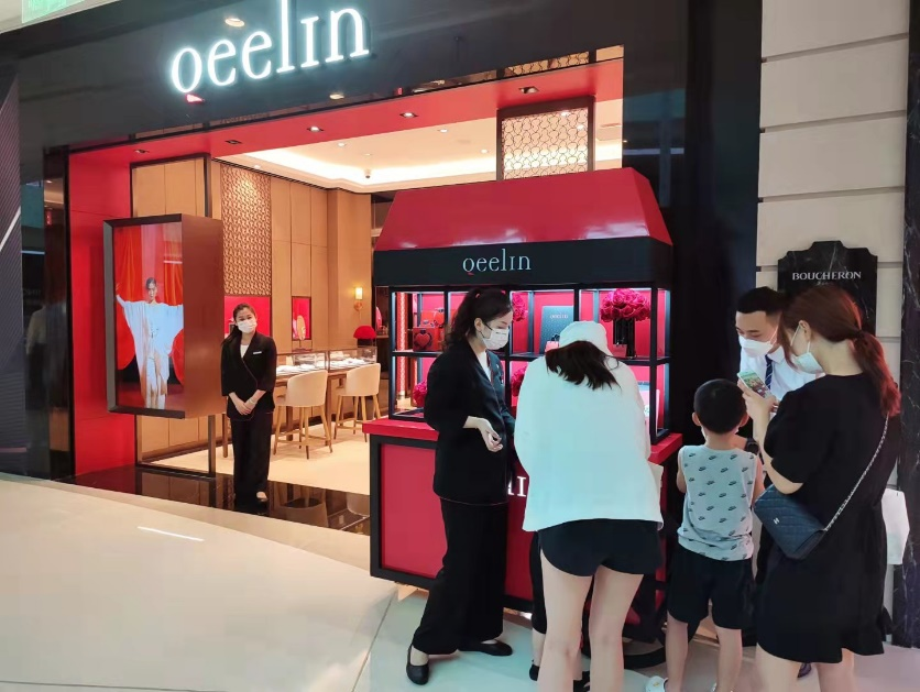 在QEELIN店前也出現(xiàn)以紅黑撞色為主色調(diào)的互動裝置,吸引不少消費(fèi)者前來參與打卡。“這個品牌的項(xiàng)鏈我很喜歡,這次來發(fā)現(xiàn)參與互動打卡還可以領(lǐng)小禮品,可以選擇的東西還挺多,我最喜歡那個小巧的包包?!眮碜詮V西的陳女士指著展示臺上的禮品說到。據(jù)了解,QEELIN此次活動禮品選取了多款式飲品、IP小熊貼紙和帶有品牌logo的裝飾包包,顧客只需拍照打卡分享至社交平臺即可領(lǐng)取心儀禮品。