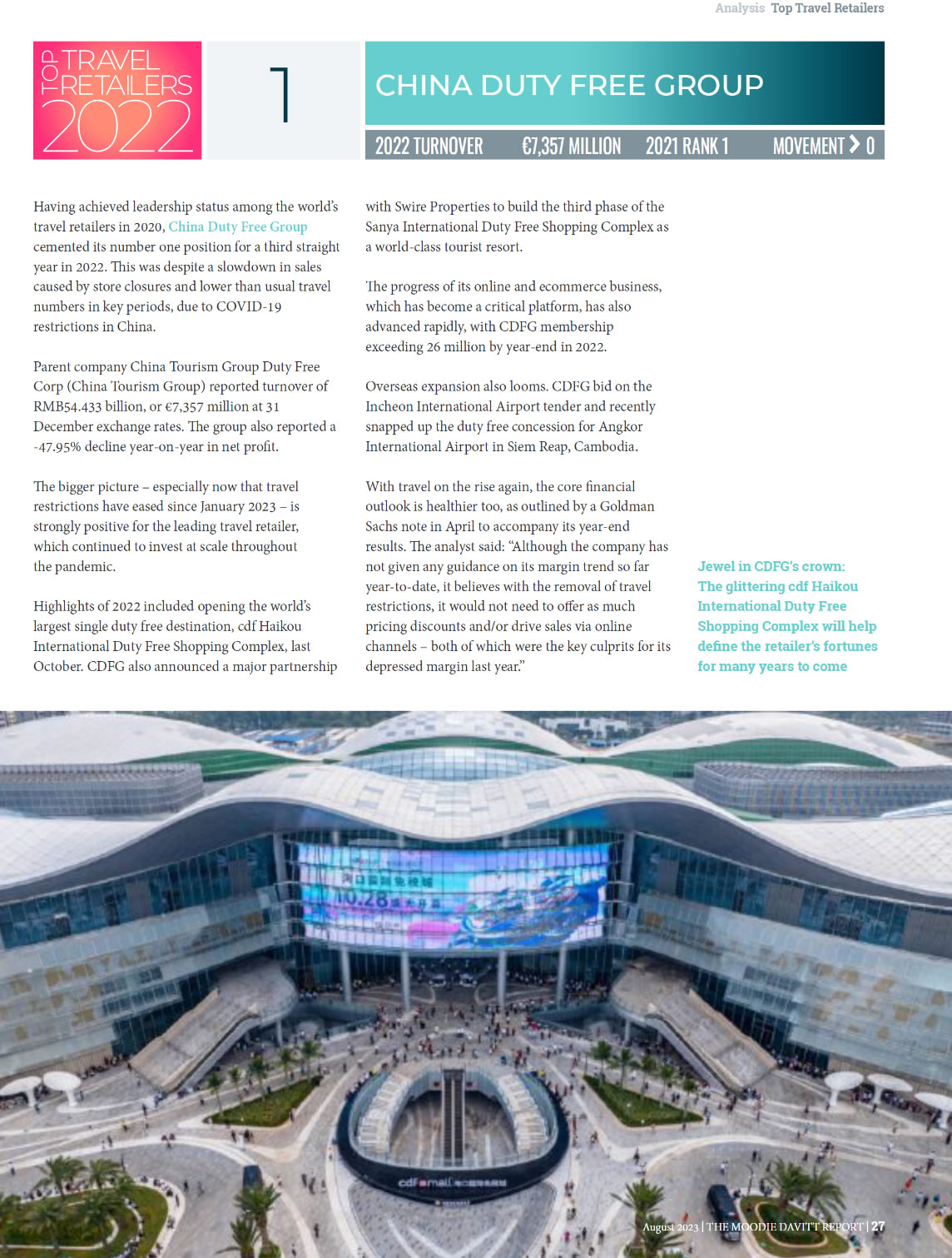 2023年8月28日,全球旅游零售行業(yè)權(quán)威媒體《穆迪達(dá)維特免稅報(bào)告》(The Moodie Davitt Report)發(fā)布《全球領(lǐng)先旅游零售商報(bào)告》,對(duì)過(guò)去一年來(lái)全球前20名旅游零售商展開(kāi)了跟蹤評(píng)估。報(bào)告顯示,根據(jù)2022年?duì)I業(yè)額統(tǒng)計(jì),中免集團(tuán)連續(xù)第三年在全球頂級(jí)旅游零售商中保持領(lǐng)先地位,成為2022年全球最大旅游零售商。